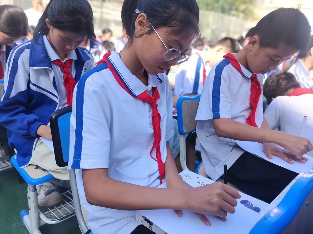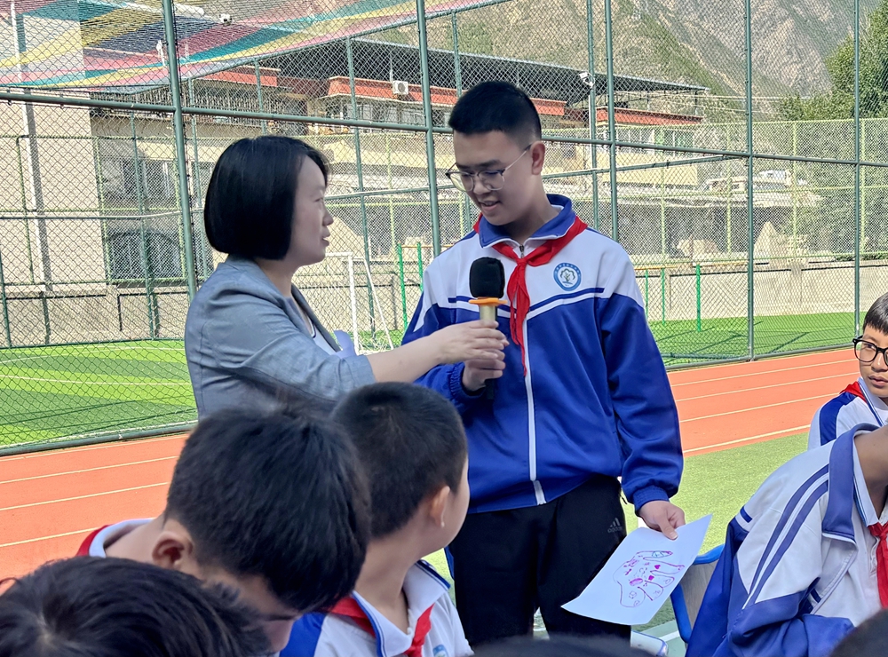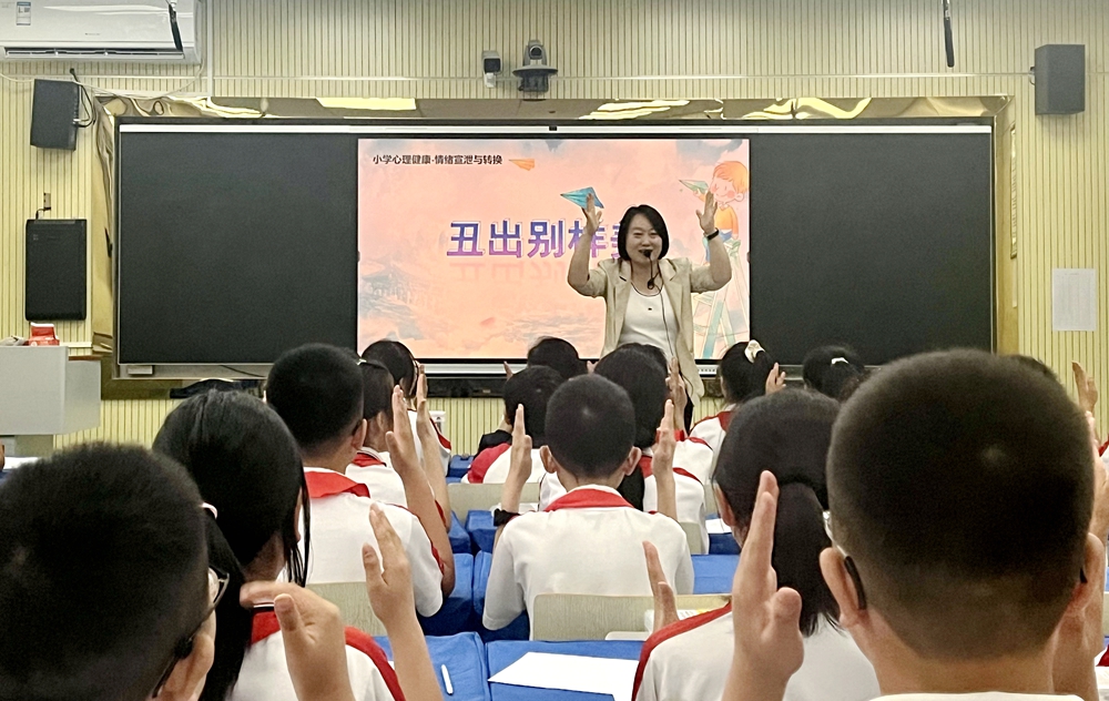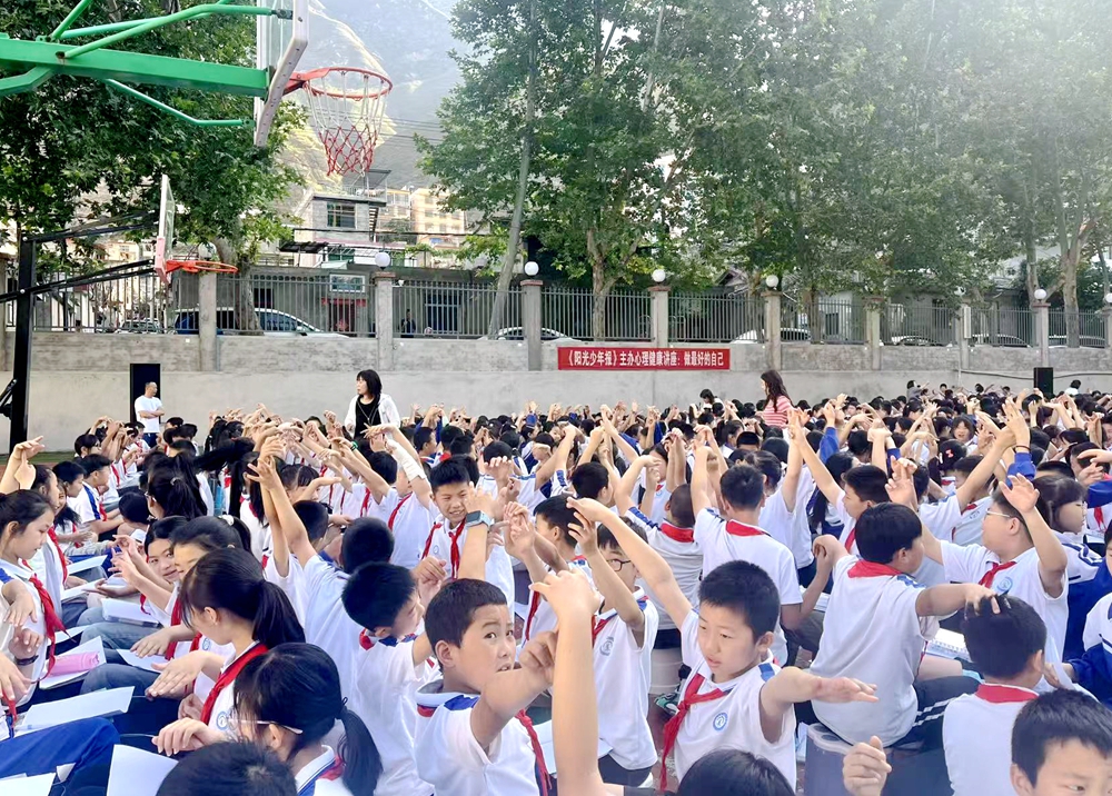 苌惠霞老师紧扣活动主题,精准把脉当地学生的实际成长需求,精心打造了《做最好的自己》《丑出别样美》《我的特点》等一系列浸润心灵的心理健康团体辅导课。课堂上,她化身智慧引路人,巧妙运用多元互动形式,引领学生在体验与实践中悄然蜕变。在《做最好的自己》活动中,大家通过暖身游戏打开自己,借助心理“手掌画”沉浸式探寻自我梦想、自身能力与品质、拥有的内部与外部资源,确立迈向梦想的扎实第一步并在师生的见证下勇敢地做出承诺。近千人的操场上学生们热情参与,能量满满!